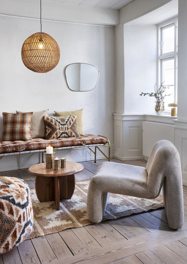 Ta ręcznie tkana poszewka marki Madam Stoltz, wykonana przez wykwalifikowanych, indyjskich rzemieślników, ma wzór inspirowany kilimem z puszystej wełny. Wykonana w 80% z wełny i 20% z bawełny, oferuje etniczny akcent w odcieniach przykurzonego niebieskiego, off white, palonej pomarańczy i piaskowego. Wytrzymały, bawełniany tył zwiększa trwałość poszewki. Użyj poszewki wszędzie tam, gdzie wnętrze potrzebuje wyrazistego, etnicznego akcentu.