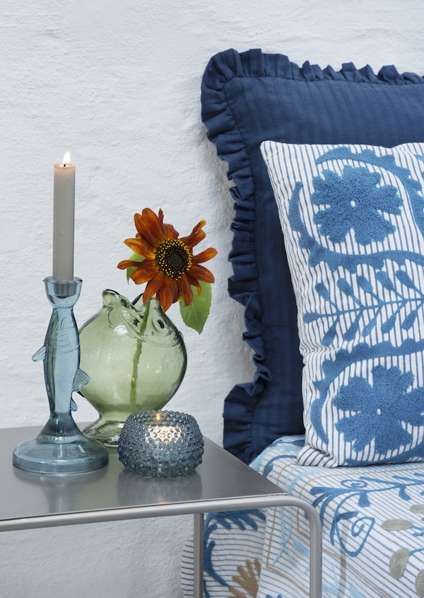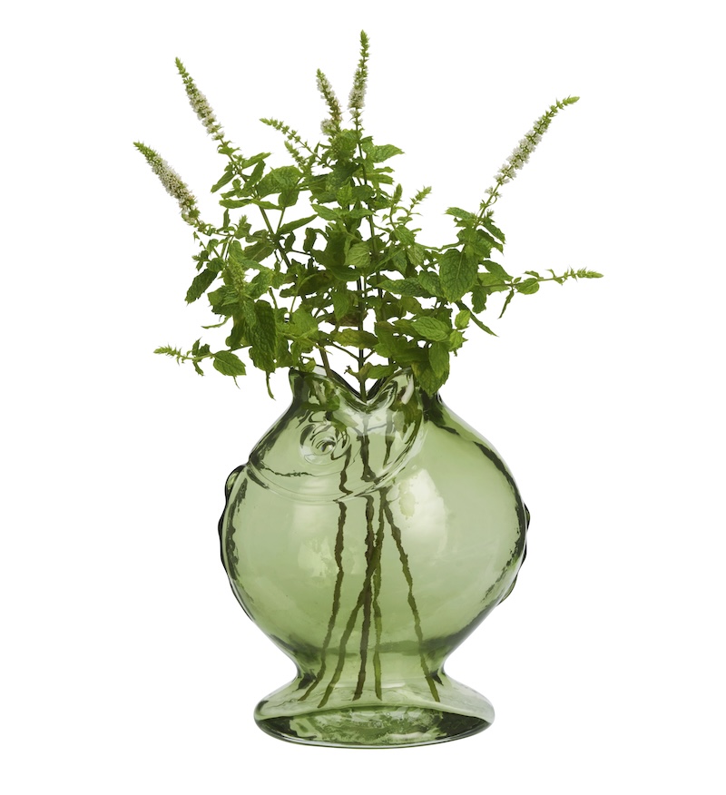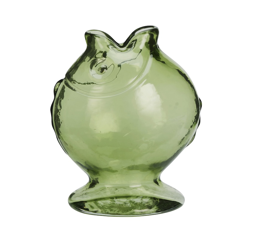 Ten wazon w kształcie ryby, ze szkła w ciemnym, zielonym kolorze, wykonany jest z barwionego, jednobarwnego szkła o subtelnej, wytłaczanej powierzchni.Grube szkło zapewnia mu pewny ciężar, podczas gdy delikatne fale łapią światło i pogłębiają ciemnozielony odcień. Jego humorystyczny, rzeźbiarski kształt dodaje każdemu pomieszczeniu radosnego charakteru. Użyj go do świeżych, sezonowych kwiatów, zintegruj z tematycznym ustawieniem stołu lub pozwól mu się wyróżniać jako samodzielnej dekoracji.Ciemnozielony kolor pasuje do liściastych łodyg, traw późnego lata i prostych, białych kwiatów, a solidna podstawa utrzymuje kompozycje stabilnie na stołach. Wazon wprowadza do wnętrza lekki, beztroski nastrój, a jednocześnie sprawia wrażenie spokojnego i przemyślanego. Delikatne detale nadają mu charakter ryby, nie wpadając w kicz, więc pasują zarówno do nowoczesnych, jak i bardziej tradycyjnych wnętrz. Niezależnie od tego, czy zawiera pojedynczą gałązkę, czy odważny bukiet, ten szklany wazon staje się opowiadaczem historii tego miejsca.